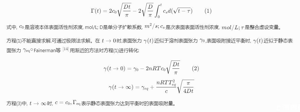 表面活性剂是一种能够在界面吸附,降低界面张力的物质。在界面快速形成过程中,如纺织品、纸和其他基质的快速润湿,液体的发泡,用静态(平衡)表面张力不能全面表征表面活性剂快速降低界面张力的能力,而动态表面张力能更好地表征表面活性剂在上述过程中所起的作用。1946年Word和Tordai研究阴离子表面活性剂的界面吸附行为,提出了描述气/液界面吸附量随吸附时间变化的Word-Tordai方程;随着各种检测手段的开发应用,20世纪90年代起,关于表面活性剂的动态表面张力及其在气/液界面吸附行为又引起该领域研究者的关注。Eastoe和Dalton通过研究双子型非离子表面活性剂在空气——水界面的吸附机理,验证了Word和Tordai提出的扩散控制吸附和混合动力控制吸附模型适用于该体系。柴金玲等利用Word-Tordai方程得到烷基聚葡糖苷(APG)在不同浓度、温度时的扩散系数和表观扩散系数,并发现盐对吸附行为有明显影响;刘杰等通过Rosen模型研究胶束对APG的动态表面张力的影响,发现各项参数的变化趋势不会因为胶束的形成而受到影响。