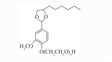 香兰素基聚氧乙烯醚left(VAEO_n,n=10right.、20,由香兰素与辛二醇在磷酸催化下生成香兰素辛二醇缩醛,再与环氧乙烷开环加成聚合反应得到,纯度95%),其EO聚合度呈泊松分布。