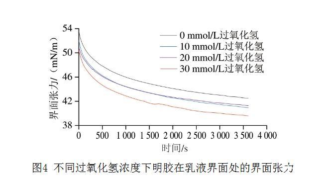 两亲性蛋白质促进蛋白质吸附到油-水界面并降低油相和水相之间的界面张力,从而形成稳定的界面层。如图4所示,氧化组的明胶界面张力均低于对照组,这表明所有明胶样品均具有表面活性。明胶在油-水界面处的界面张力随着过氧化氢浓度的增加而降低。不同过氧化氢浓度下明胶的界面张力随时间的延长逐渐降低,从未氧化组的53.8 mN/m下降到30 mmol/L组的50.7 mN/m。界面张力随着吸附时间的延长而降低,下降速率逐渐减小,这反映了蛋白质在界面上的吸附和覆盖。明胶界面张力的下降与其更好的两亲性有关。因此,在本研究中氧化导致明胶水接触角的增加,提高了明胶的疏水性并改善了明胶的两亲性,增加了蛋白质向油-水界面的吸附,这可能引起油-水界面张力的下降。Feng Xin等支持这一观点并报道,在猪皮明胶的提取过程中提高提取温度也会引起界面张力的降低,并认为随着提取温度的升高会破坏明胶原有的三螺旋结构,从而暴露出更多的疏水基团,这促使明胶分子能够更快地吸附到油-水界面上,从而更大程度地降低界面张力。
