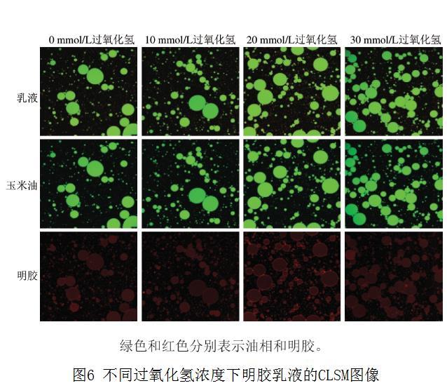 乳液通常是指将一相作为液滴分散在另一相中。如图6所示,随着过氧化氢浓度的增加,乳液的液滴尺寸减小,这可能与较少的蛋白质吸附到油-水界面层有关。据报道,EAI较高的蛋白质有利于吸附到油-水界面,减少油-水界面的界面张力并表现出更加小而密集的乳液液滴。本研究中明胶吸附率及界面张力的测定结果可以支持氧化明胶更容易吸附到油-水界面这一观点。