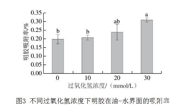如图3所示,乳液中油-水界面的明胶吸附率随着过氧化氢浓度的增加而增加,从对照组的19.8%增加到30 mmol/L过氧化氢组的30.9%,增加1 倍左右,这表明更多氧化明胶分子吸附到油-水界面。Chen Jiahui等对肌原纤维蛋白进行超声处理,发现超声处理改变了肌原纤维蛋白的结构,从而有利于形成尺寸更小、更灵活的聚集体,促进蛋白质在油-水界面的吸附,减少油-水界面的界面张力。在米糠蛋白的氧化中也观察到类似的现象。氧化导致米糠蛋白中暴露出更多的疏水基团,促进了蛋白质在油-水界面的吸附,形成黏弹性膜,降低界面张力,使液滴分裂成更小的尺寸。相似地,Zou Heinan等利用高强度超声处理减小了贻贝肌浆蛋白的尺寸并增强了其表面疏水性,从而增加了蛋白质在油-水界面的吸附。