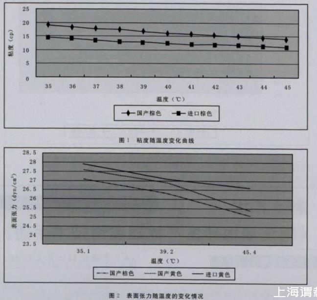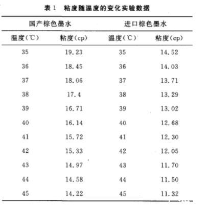 3)进口陶瓷墨水与国产陶瓷墨水相比,内在的性能参数(表面张力、粘度、容重)随温度变化的规律一致。