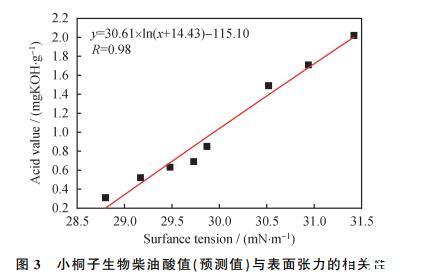由图2可知,拟合后得到的方程为y=0.69x-19.61,相关系数R=0.99,说明表面张力与酸值的相关度比较高。综合图1、图2可知,氧化时间、表面张力、酸值三者之间的相关性较高,因此表面张力可作为评估生物柴油降解阶段的参数,可用于预测其酸值。