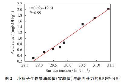 同时,对样品的酸值与表面张力进行了相关性分析,如图2所示: