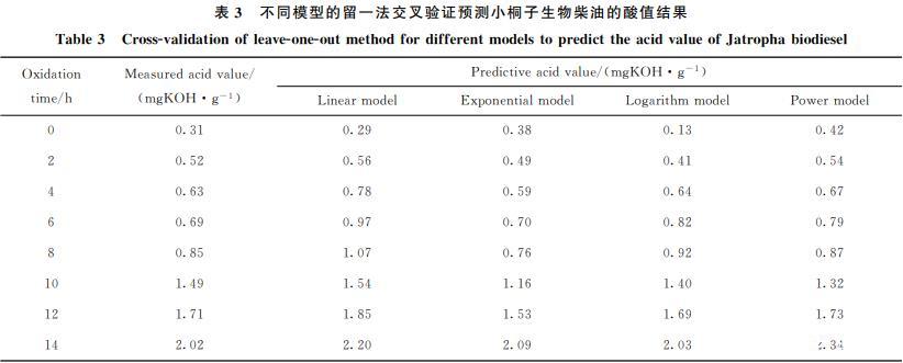 留一法交叉验证是建立预测模型的一种常用方法,从N个观测数据中选择一个观测数据作为验证数据,然后使用剩下的(N-1)个观测数据拟合一个模型,并用验证数据来验证模型的精度,如此重复N次。考虑到数据量以及相关性,笔者利用Excel建立了线性、指数、对数、乘幂4种预测模型,对小桐子生物柴油酸值的预测结果见表3。
