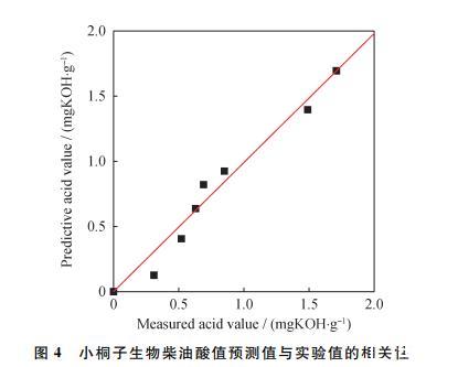 图4为小桐子生物柴油的酸值实验值与对数模型预测值的函数关系: