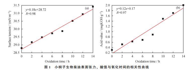 (1)小桐子生物柴油在氧化过程中会有醛、酮、相对分子质量较高的含氧化合物及其可溶性聚合物生成。氧化14h后,其密度、表面张力以及酸值分别增加3.8%、9.1%和551%。