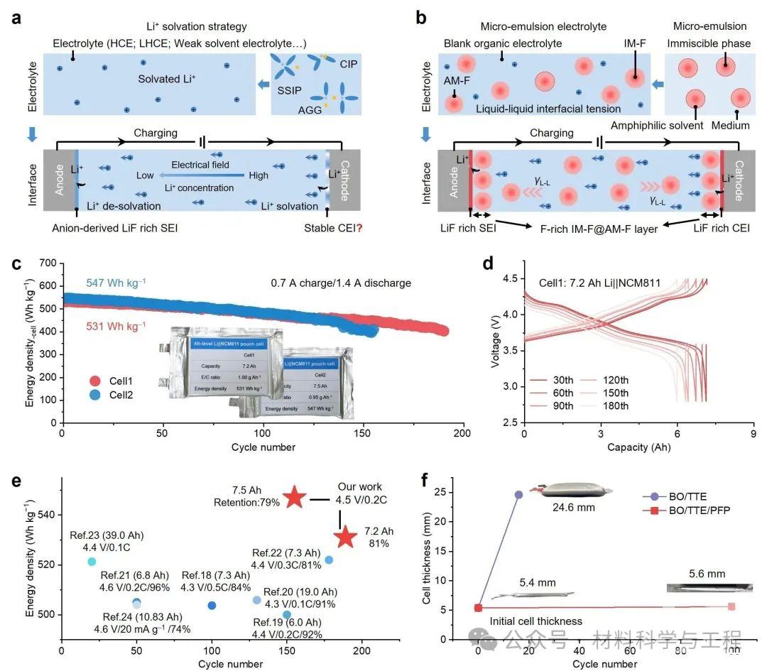 图1(a)、(b)Li+在充电过程的传输行为及正负极界面演化示意图,对应Li+溶剂化策略(a)和微乳电解液策略(b);(c)Li||NCM811软包电池在微乳电解液中的循环性能;(d)电池的电压-容量曲线;(e)本文与报道的电池性能对比;(f)电池在循环前后的厚度变化