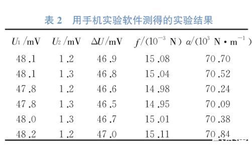 利用改装后的液体表面张力系数测量仪和手机实验软件记录实验数据,实验数据可在手机屏幕实时显示,拖动手机屏幕找到“拉断液柱”时所对应的数据,测得的U1和U2数据如表2所示。