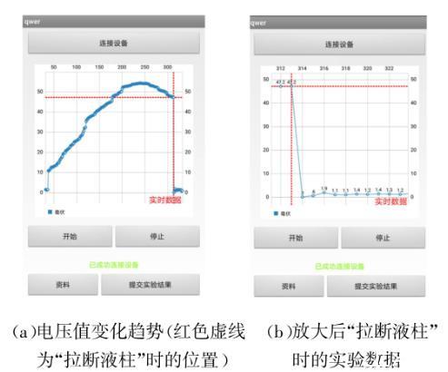 针对传统实验模式中记录数据的缺点,在智能手机上开发了专门的实验软件,通过手机的蓝牙连接到实验仪器,将实验所采集到的所有电压表读数实时传送到智能手机上,然后在智能手机上以坐标点的形式描绘出电压表读数的变化,在智能手机端就可以观察到金属环与液面分离瞬间的数据变化,很方便地读取到“拉断液柱”瞬间的实验数据。