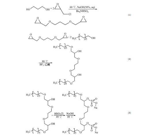 材料有:1-十二烷醇C12H25OH,化学纯,济宁宏明化学试剂有限公司生产;四丁基硫酸氢铵(TBAHS)Bu4NHSO4,分析纯,天津致远化学试剂有限公司;1,3-丙二醇HOCH2CH2CH2OH,分析纯,济宁宏明化学试剂有限公司生产;环氧氯丙烷C3H5ClO,化学纯,济宁宏明化学试剂有限公司生产;氢氧化钠NaOH,分析纯,济宁宏明化学试剂有限公司生产;无水乙醇C₂H₅OH,化学纯,济宁宏明化学试剂有限公司生产;BF3-乙醚溶液,北京化工厂生产;氯磺酸HSO3Cl,化学纯,成都化夏化学试剂有限公司生产;去离子水,分析纯,实验室自制。