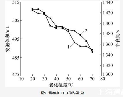 将起泡剂溶液在一定温度下老化一定时间后,测试其发泡体积和泡沫半衰期的变化以评价其抗温性能。称取0.2 g起泡剂ULT-1于搅拌杯中,加入100 mL蒸馏水,置于搅拌器之上,以转速11 000 r/min搅拌1 min。装入老化罐,放入滚子加热炉,在一定温度下滚动16 h,取出冷却至室温,以转速11 000 r/min搅拌1 min,测量发泡体积和半衰期。通过改变老化温度测量起泡性能与老化温度的关系,结果如图9所示。从图9可知:0.2%的新型起泡剂溶液在一定温度范围内(20~70℃),随着老化温度的升高起泡性能基本不变,表明研制的新型起泡剂ULT-1具有较好的抗温性能。