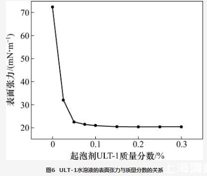 当起泡条件相同时,起泡剂水溶液的表面张力越低,发泡体积越高。配制一系列浓度梯度的起泡剂ULT-1水溶液,利用接触角/表面张力测量仪采用悬滴法测量表面张力与起泡剂ULT-1质量分数的关系,结果如图6所示。从图6可知:当起泡剂ULT-1质量分数小于0.05%时,表面张力随起泡剂ULT-1质量分数的提高快速降低;当起泡剂ULT-1质量分数大于0.05%时,表面张力降幅越来越小;当起泡剂ULT-1质量分数提高至0.2%时,表面张力降至20.40 mN/m,较蒸馏水降低了71.82%,继续提高起泡剂ULT-1的质量分数,表面张力不再降低。表明新型起泡剂ULT-1在较低浓度时即达到较低的表面张力,有利于提高发泡体积。