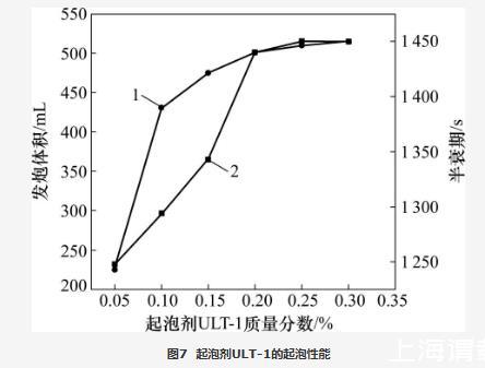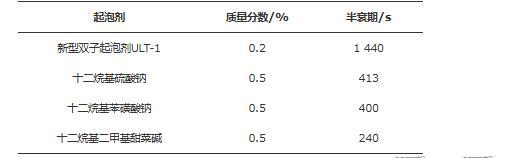 起泡性能主要是指起泡能力和泡沫稳定性。发泡体积V0反映了起泡能力,析液半衰期t1/2反映了泡沫稳定性。在室温下,称取一定质量的起泡剂ULT-1于搅拌杯中,加入100 mL蒸馏水,置于搅拌器之上,以转速11 000 r/min搅拌1 min。搅拌完毕后,立即取下搅拌杯,同时启动秒表,开始记录消泡时间,将搅拌杯中的所有物质全部倒入1 000 mL量筒中,读取发泡体积和从泡沫中析出50 mL液体的时间,即为半衰期。通过改变起泡剂ULT-1的质量测量起泡性能与起泡剂质量分数的关系,结果如图7所示。从图7可知:随起泡剂ULT-1质量分数的提高,发泡体积增加幅度较大,半衰期缓慢增加。当ULT-1质量分数升到0.2%时,发泡体积达到501 mL,半衰期达到1 440 s,继续提高质量分数发泡体积和半衰期基本不变,表明研制的新型起泡剂ULT-1低浓度时即具有较高的起泡性能,发泡体积高,泡沫半衰期长。同时,对比评价了常用起泡剂的半衰期,结果如表1所示。从表1可知:质量分数为0.2%的起泡剂ULT-1与质量分数为0.5%的常规起泡剂相比,泡沫半衰期可提高3倍以上。