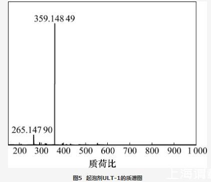 利用电喷雾质谱法表征起泡剂ULT-1的分子结构,结果如图5所示。从图5可知:起泡剂ULT-1的相对分子质量为764,脱去2个Na+后的阴离子碎片相对分子质量为718,带2个负电荷,质荷比为359,与质谱图上359.148 49的峰一致,265.147 90的峰为杂质十二烷基硫酸钠脱去1个Na+后的阴离子碎片形成的,表明成功合成了所设计的起泡剂。