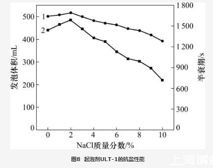 利用抗NaCl污染的能力评价质量分数为0.2%起泡剂ULT-1水溶液的抗盐性能。在室温下,称取0.2 g起泡剂ULT-1于搅拌杯中,加入100 mL蒸馏水,置于搅拌器之上,以转速11 000 r/min搅拌1 min。直接加入一定量的NaCl,以转速11 000 r/min搅拌1 min,测量发泡体积和半衰期。通过改变NaCl的质量分数测量起泡性能,结果如图8所示。从图8可知:当NaCl质量分数在2%以内时,发泡体积和半衰期缓慢增大,当NaCl质量分数继续增大时,发泡体积和半衰期缓慢降低;当NaCl质量分数达10%时,发泡体积和半衰期仍能保持较高水平,表明研制的新型起泡剂ULT-1具有较好的抗盐性能。