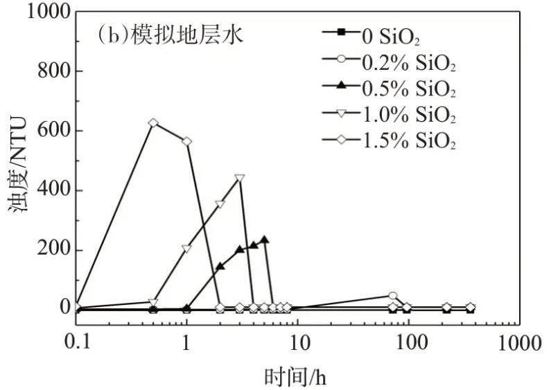 利用沉降法和浊度法分析分别用NaCl盐水、模拟地层水配制的不同纳米SiO2含量的纳米SiO2/SDS体系的稳定性,浊度法测试结果如图1所示。用NaCl盐水配制的SiO2/SDS体系在静置15 d时,仅纳米SiO2质量分数为1.5%的体系出现了轻微的浑浊,而其它体系均保持澄清透明;当纳米SiO2质量分数为1.5%时,SiO2/SDS体系的浊度随静置时间的延长稍有增大,其它体系的浊度几乎不随静置时间的延长而变化,且均小于15 NTU。由此可见,用NaCl盐水配制的纳米SiO2/SDS体系的稳定性良好。