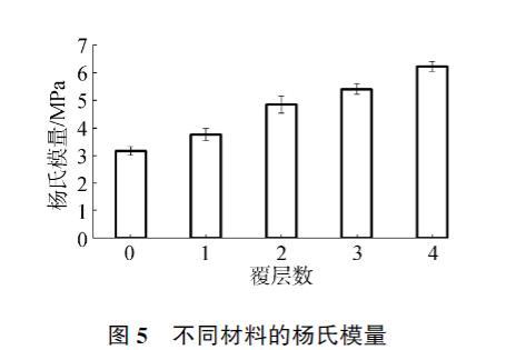 对羟基磷灰石和覆层材料的杨氏模量进行了测量,结果如图5所示。空白的羟基磷灰石材料的杨氏模量为3.14±0.16 MPa,随着覆层层数的增加杨氏模量逐渐增加,最高可达6.21±0.18 MPa,说明胶原蛋白肽的覆层能够有效地改善羟基磷灰石材料的力学性能,提高其杨氏模量。