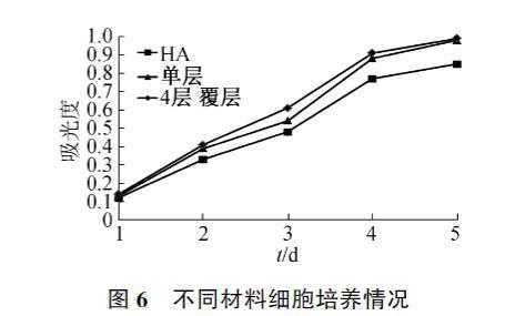 MC3T3-E1细胞在羟基磷灰石和覆层材料上培养5天的增殖情况见图6。因结果类似,图中仅列出了单层和4层覆层材料的增殖结果,可以看出在覆层材料上MC3T3-E1细胞增殖要优于空白羟基磷灰石材料,表明所制覆层材料不仅无细胞毒性,而且因胶原蛋白肽的优良生物相容性,能一定程度上促进细胞增殖。所用的羟基磷灰石和胶原蛋白肽都是经过实践证明的生物相容性良好的材料,其对材料生物性能的提升作用是由其本身的生物相容性良好引起的,因此覆层层数对生物性能提升作用不明显。