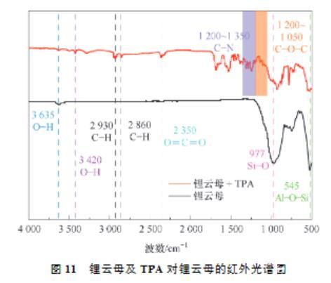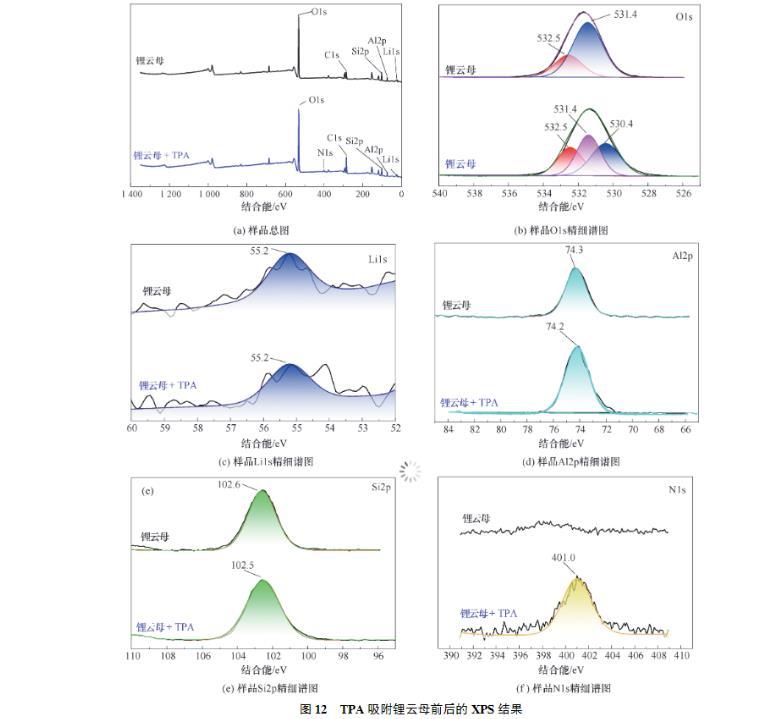 (2)接触角试验表明,同等条件下,TPA作用锂云母的接触角总是大于DDA,展现了TPA更强的疏水性。Zeta电位测试结果表明,TPA及DDA在锂云母表面的吸附为静电吸附,并且碳链更长的TPA由于疏水效应吸附性更好,进一步证明了TPA的强疏水性。FTIR及XPS进一步证实了TPA吸附在锂云母表面。