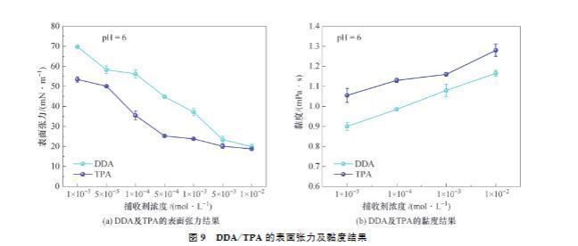 DDA及TPA的黏度结果如图9(b)所示。由图9(b)可知,弱酸性条件下,DDA或TPA的黏度均随着捕收剂用量的增加而增大,这说明DDA或TPA均能增强溶液黏度。当捕收剂浓度一致时,TPA的黏度总是大于DDA,这说明较高黏度的TPA具有更稳定