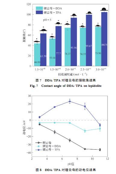 DDA及TPA的接触角结果如图7所示。pH值为5时,表征疏水性的接触角均随着捕收剂(DDA或TPA)浓度的增加而增大。图6(b)浮选浓度试验结果与图7接触角试验结果的变化趋势接近,说明捕收剂的浮选性能与疏水性大小关系密切。此外,相同浓度下,TPA作用后锂云母的接触角总是大于DDA作用后的,这也与图6(b)浮选浓度试验结果一致。与浮选试验类似,当药剂用量达到2.5×10⁻⁴mol/L时,DDA或TPA对锂云母接触角变化的影响较小。