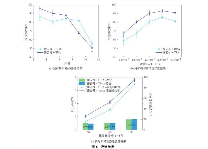 浮选测试结果如图6所示。由图6(a)可以看出,在酸性条件下,DDA及TPA对锂云母的浮选回收率较高,而在碱性条件下浮选回收率均下降,如pH值为3时,TPA对锂云母浮选回收率可达95.62%,而在pH值为11时仅为50.60%。此外,酸性条件下TPA对锂云母的浮选回收率高于DDA,如pH值为3时,DDA、TPA对锂云母浮选回收率分别为86.28%和95.62%。
