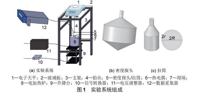 实验系统由测量系统、加热系统、控制系统和支撑系统组成。实验系统如图1(a)所示。测量系统由高精度电子天平(型号为METTLER TOLEDO ME104,精度为0.1 mg)、数据采集器(型号为key sight 34872 A)、热电偶(K型)、探头组成;加热系统由电加热炉和坩坩埚埚组成;控制系统由电压调整器(型号为T6-1-4-060 DC)、智俊软件组成;支撑系统由升降台、钢架、玻璃板组成。