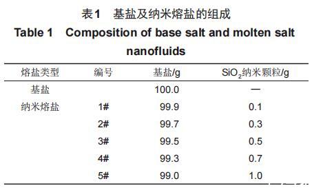 本实验所用材料为NaNO3、KNO3和30nm的SiO2纳米颗粒。所有实验材料在制备纳米熔盐之前均需要经过干燥处理。使用型号为Mettler Toledo ME104,精度为0.1mg的电子天平对干燥后的熔融盐和纳米颗粒进行称量。见表1,按照比例将基盐及纳米颗粒进行称量后,利用高温熔融法将SiO2纳米颗粒均匀分散至基盐中,将制备好的纳米熔盐样品放入干燥箱中保存备用。