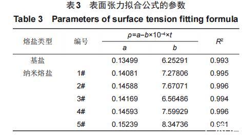 利用拉筒法对配制的基盐及5种加入30nm SiO2纳米颗粒的纳米熔盐的表面张力进行测量,每隔10℃进行一次测量,对得到的实验数据进行整理和分析,拟合公式以及拟合系数见表3。