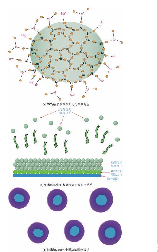 (4)采用高温熔融法制备纳米熔盐时,由于SiO2纳米颗粒表面缺少配位的原子,熔融盐分子会在SiO2纳米颗粒周围先形成化学吸附层,随后由于搅拌的作用,形成物理吸附层,最终以纳米云核的形式存在于熔盐体系中。