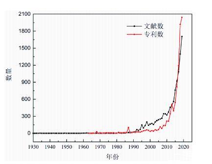 图2气凝胶论文与专利发表数量与年度趋势图,数据统计于web of science