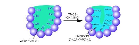 如图6所示,采用三甲基氯硅烷(trimethyl chlorosilane,简称TMCS)对氧化硅凝胶孔壁表面进行疏水化处理,可实现常压干燥制备气凝胶。其中TMCS和异丙醇(isopropanol,简称IPA)分别作为疏水化试剂和溶剂。TMCS与靠近颗粒表面的孔反应,使孔壁表面的Si-OH转化成硅甲基,有利于阻止水的吸附,形成孔表面疏水区域。同时,TMCS水解缩合生成六甲基二硅氧烷(hexamethyldisiloxane,简称HMDSO),且不与水混溶,随着反应的持续进行,水相逐渐从孔中排出,最终形成超疏水气凝胶。