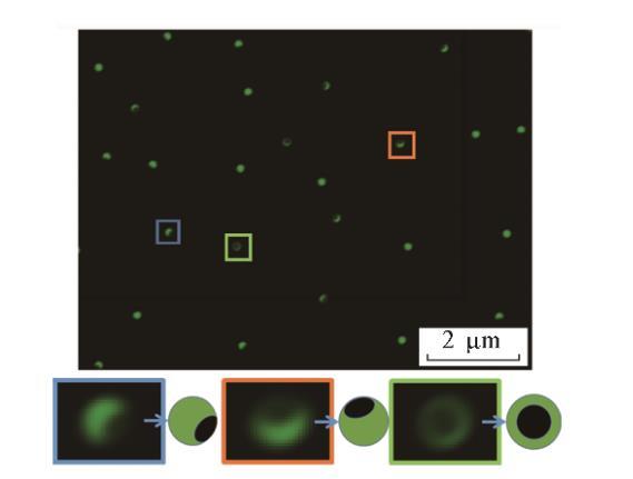 为了验证合成的Janus颗粒表面具备非对称结构,对涂覆APS的颗粒表面接枝荧光剂FITC。结果如图3所示,荧光Janus颗粒表面一侧的荧光性明显比另一侧更强,并且荧光部分所占面积大于非荧光部分。这不仅证实了所制备的Janus颗粒具有非对称结构,也说明非对称结构的两个改性区域面积不相等。Janus颗粒表面接枝PFTS的一侧出现微弱的荧光主要是由纳米SiO₂颗粒边缘的荧光基团发出的亮光所产生的漫反射和散射造成的。