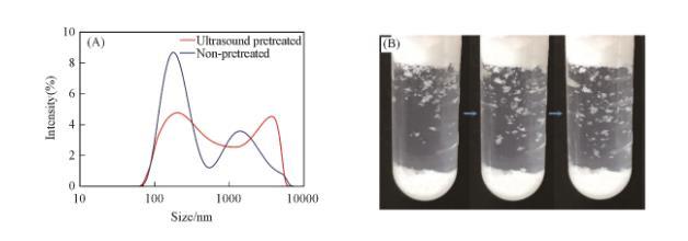 值得注意的是,如果粒子首先用超声波分散在液体中,然后以相同的方式振荡,则颗粒产生的泡沫高度有所下降[图6(A)]。因此对比了振荡和超声波处理后的颗粒在液体中团聚体的粒径大小。采用动态光散射仪间接表征了颗粒在液体中的团聚情况[图7(A)]。可以看出,振荡后的液体中有较多物质的粒径大于单个颗粒直径,而且粒径分布很宽。这证明液体中存在明显的颗粒团聚体。由于颗粒本身存在巨大的表面能,多数颗粒在空气中已经自发团聚。颗粒在液体中大多也以团聚体的方式存在。少量空气被密封在浸没于油相中的颗粒团聚体内部,这部分不与外界联通的空气提供了额外的压力,进而阻止了进一步渗透。这种颗粒团聚体表面同样形成了由Cassie-Baxter方程描述的复合表面,该复合表面的形成保护了构成团聚体的颗粒不被完全润湿,并使团聚体表面具有合理的疏油性(cosθ_CB的值接近0),从而在热力学上团聚体便于发生吸附。而溶液经超声波处理后颗粒被润湿,团聚体被破坏使尺寸变小,并且均匀分布在溶液中。图6(B)显示了在经超声波处理后的表面张力测试数据,同样表明团聚体被破坏后,被润湿的颗粒不再倾向于吸附在表面上。