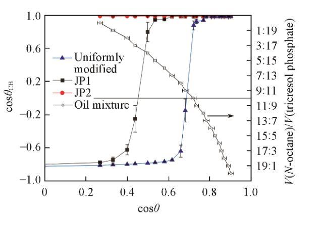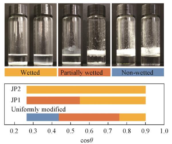 放置在静止液体表面的颗粒的润湿行为由图5示出。随着液体表面张力的增加,从光滑的氟碳链覆盖的表面获得的cosθ值同时增大,液体顶部的表面出现明显的不溶颗粒。这种颗粒不润湿的情况与颗粒形成粗糙表面测量的结果具有相关性。干燥的颗粒以蓬松状态直接向油相倾倒,如果在油相表面能形成足够强壮的、由颗粒组成的亚稳态Cassie-Baxter状态,那么疏油表面将会形成,并阻止其它颗粒接触油相,宏观表现为颗粒不润湿。相反,如果油相表面由颗粒组成的亚稳态Cassie-Baxter状态鲁棒性不足,在手动振荡或重力作用下,颗粒或颗粒团聚体接触油相并浸没在油相中。亚稳态鲁棒性与颗粒表面材料润湿角密切相关,即不同类型的颗粒具有明显不同的润湿转折点。JP1润湿性转折点位于均匀修饰颗粒右侧,JP2没有发现润湿转折点。这与颗粒上接枝的烷烃链数量有关。JP2上尽管存在氟碳链,但由于烷烃链覆盖的面积太大,使颗粒整体表现出强烈的亲油性。