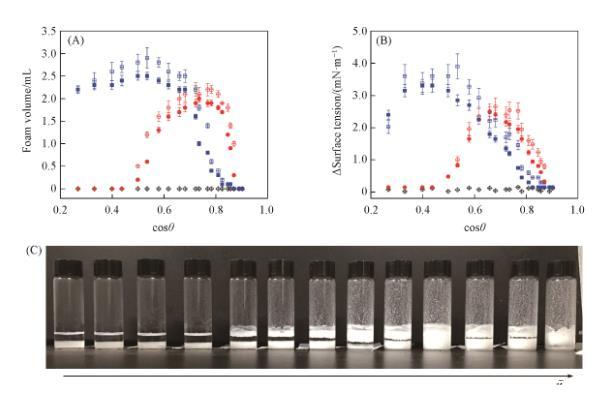 在油相中有无颗粒条件下的表面张力差如图6(B)所示。颗粒吸附在表面上会导致表面张力下降。无论均匀修饰颗粒还是Janus颗粒,表面张力的下降程度和泡沫体积有一个最大值。表面张力下降程度的最大值出现时,cosθ大于0.39(θ < 70.1°),而泡沫体积的最大值出现时,cosθ大于0.49(θ < 67.0°)。许多研究人员得到的关于颗粒稳定的泡沫的结论为:颗粒接触角等于90°时泡沫最稳定。值得注意的是,在这一结论中,默认颗粒是以单一的、独立的形式向界面吸附。如果基于这些理论,在单个颗粒的接触角接近90°时,表面张力的下降程度应该最大,这与本文研究结果不符。结合图4可见,在粗糙表面的亲油-疏油状态发生转变(即cosθ_CB跨越0点)的cosθ值附近,表面张力下降幅度最大。这对应着颗粒是否向表面吸附与颗粒构成的粗糙表面的接触角θ_CB相关,而不是单个颗粒表面的接触角θ,为此本文开展了进一步研究。