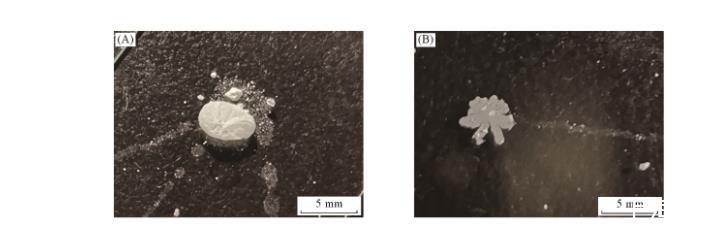 在颗粒参与形成“泡沫”过程中,存在另外一种现象(见图8)。在磷酸三甲酚酯溶液中,颗粒附着在液气表面上,有可能形成气相为连续相、液相为非连续相的状态[图8(A)]。在无外力作用下,该液滴能够保持长时间稳定。如果推动液滴,颗粒从气液表面脱落[图8(B)],则液滴破碎,留下一层颗粒组成的薄膜。