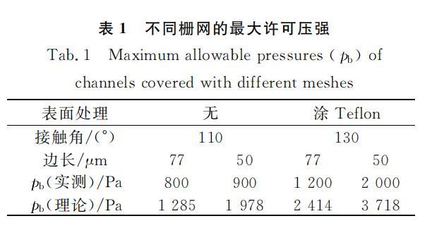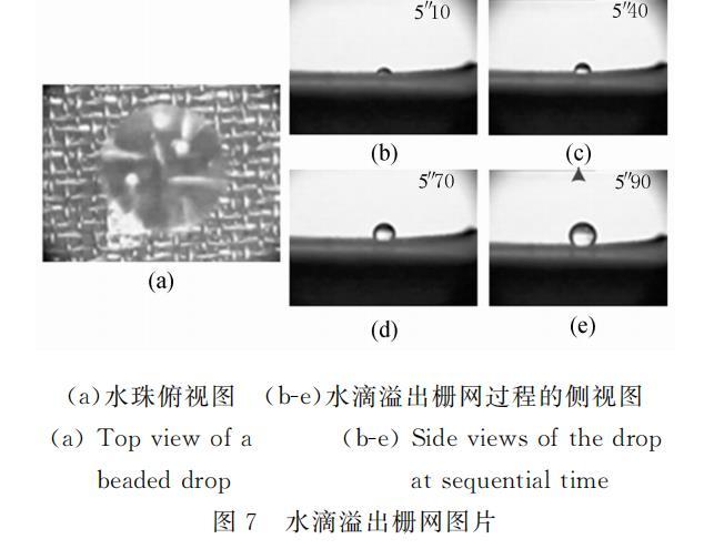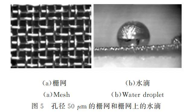 所用栅网为不锈钢滤网,有一定刚度,管道较窄,可以保证管道顶面平整。栅网孔为方形,使用的两种栅网孔边长分别为50mu m和77mu m。部分栅网涂覆Teflon(AF2400,DuPont),部分没有做处理。图5所示为未经处理的栅网和栅网上的水滴。