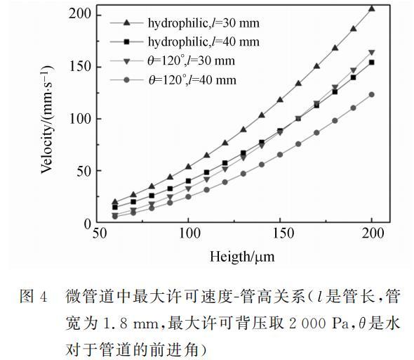 利用约束条件式(5)或(6),可以得到管道中液体的最大许可速度。为了简化分析,假设出口处压强为0。计算中假设管道各个壁面性质相同。利用式(4)计算压降时要求流动定常,当液体流过干燥管道时并不是定常流动,利用式(4)作近似计算。最大许可速度与管道高度的关系如图4所示,包括疏水管道和亲水管道两种情况。可以看出,管高一定时,在亲水管道中最大许可速度较大,且最大许可速度随管高增加而增大,随管长的增加而减小。