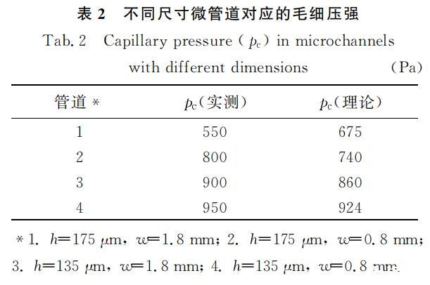 毛细压强是微管道中水由静止到开始流动时对应的转折压强。实验中采用CCD测量微管道中液体前端的前进速度,并记录相应的水头高度H。每次测量之前需把管道烘干。