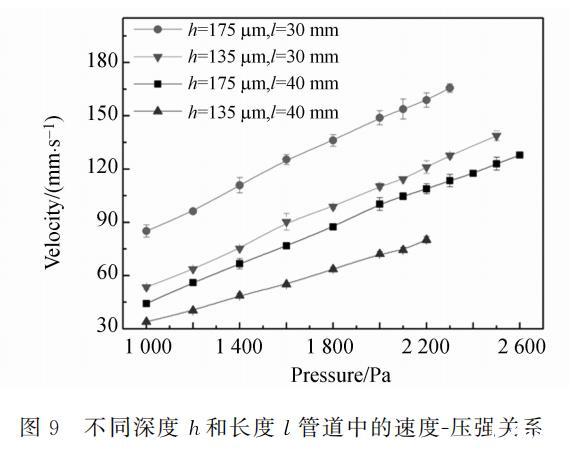 管道中充满水时的速度-压强关系如图9所示。管道截面尺寸主要通过等效水力直径影响摩擦阻力系数。由于管道深度远小于宽度,管道的等效水力直径取决于管道深度,故这里固定管道宽度而对不同深度的管道进行比较分析。由图9可知,压强一定,管道越深,长度越短,对应的流速越大。图中每条曲线的最大压强就是测量中每个管道的最大许可压强,这些压强值都大于表1中的最大许可压强实测值。这一方面是由于栅网孔径分布不均匀,另一方面是由于沿程水头损失作用,管道中压强分布沿流动方向减小,导致最大压强没有出现在孔径最大的地方,从而得到的压强大于静止状态下测得的最大许可压强。