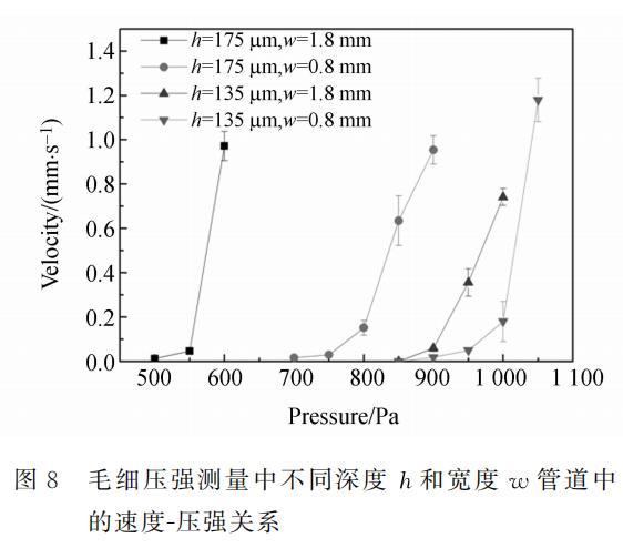 PDMS微管道采用软光刻工艺制作。PDMS结构层从模具揭下后,倒过来粘接在基底上,管道裸露朝上,形成开放管道。然后用压敏胶(ARclad IS-7876,Adhesives Research.Inc.)将棚网粘接到开放管道上。制作的微管道宽分别为0.8~mm和1.8~mm,深75mu m和115mu m,长3cm和4cm。压敏胶厚约60mu m,最终得到的开放管道高度约135μm和175μm。