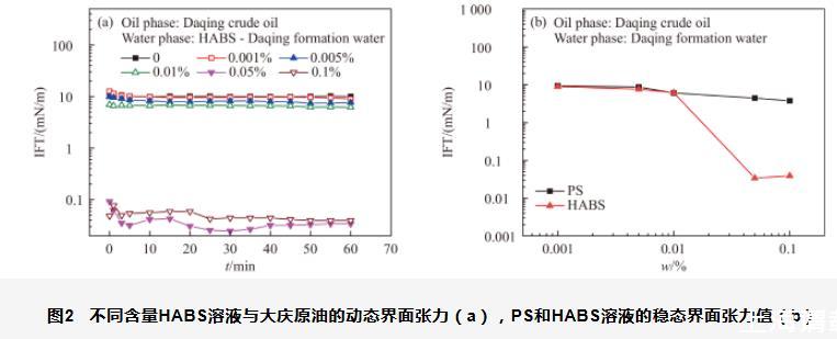 图2不同含量HABS溶液与大庆原油的动态界面张力(a),PS和HABS溶液的稳态界面张力值(b)