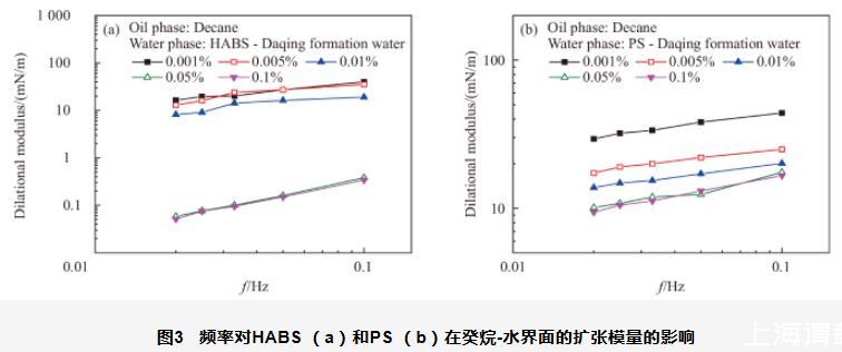 图3频率对HABS(a)和PS(b)在癸烷-水界面的扩张模量的影响