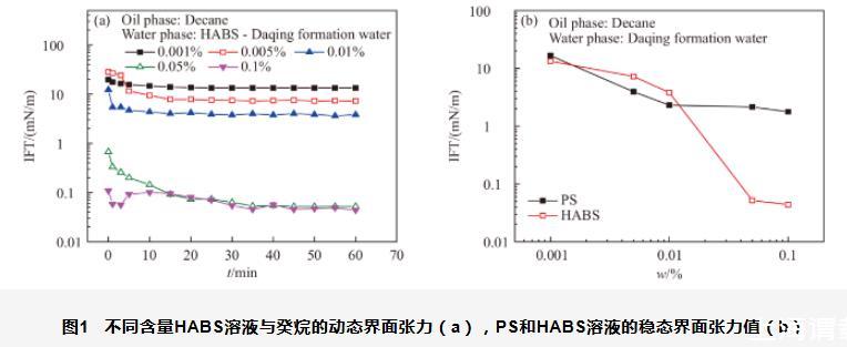 图1不同含量HABS溶液与癸烷的动态界面张力(a),PS和HABS溶液的稳态界面张力值(b)