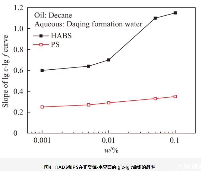 图6原油-水界面HABS和PS溶液的lgε-lg f曲线的斜率值