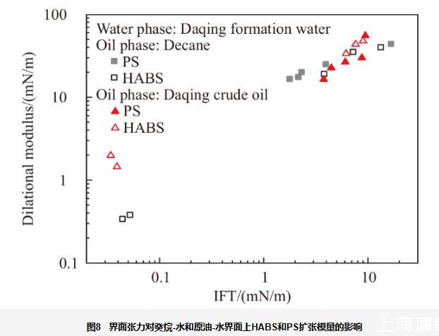 图8界面张力对癸烷-水和原油-水界面上HABS和PS扩张模量的影响