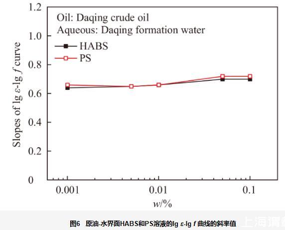 图6为PS和HABS在原油-水界面的lgε-lg f曲线的斜率。在原油-水界面,HABS的斜率与PS的斜率几乎相同,都约为0.7。这与图4中正癸烷-水界面的两种表面活性剂的曲线斜率明显不同。PS在原油-水界面的斜率值比在正癸烷-水界面的斜率值高,而HABS在原油-水界面的斜率值比在正癸烷-水界面的斜率值低。这是由于大庆原油的活性组分在界面上混合吸附,对界面膜的黏弹特性也有贡献。大庆原油属于轻质原油,原油组分中小分子量的石油酸组分较多,尺寸较大的沥青质较少。小分子量原油活性组分在界面上的吸附,一方面降低了分子尺寸较小的HABS体系的黏性,一方面增大了分子尺寸较大的PS体系的黏性。因此,在原油-水界面,HABS和PS体系lgε-lg f曲线的斜率相差不大。