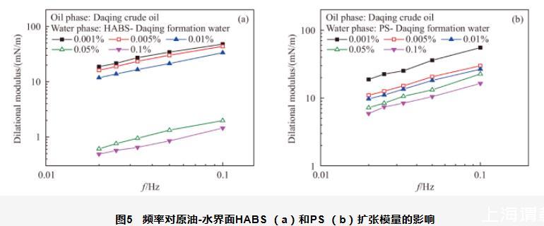 图5频率对原油-水界面HABS(a)和PS(b)扩张模量的影响